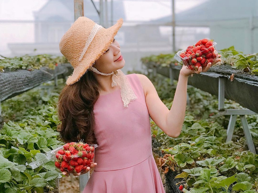 Vườn dâu chú Hùng: Nông trại ngập tràn sắc xanh, điểm nhấn là dâu tây chín đỏ, căng mọng, là phông nền lý tưởng để sống ảo. Tới đây, bạn có thể tự tay thu hoạch dâu tươi, được trồng trong nhà kính, theo các tiêu chuẩn nhà vườn sạch. Ngoài ra, bạn còn được chủ vườn hướng dẫn cách trồng và chăm sóc dâu tỉ mỉ. Nông trại không thu phí tham quan, chụp hình. Dâu tươi tại vườn có giá khoảng 160.000 đồng/kg. Địa chỉ: Thánh Mẫu, TP Đà Lạt. Ảnh: Quyenken27.