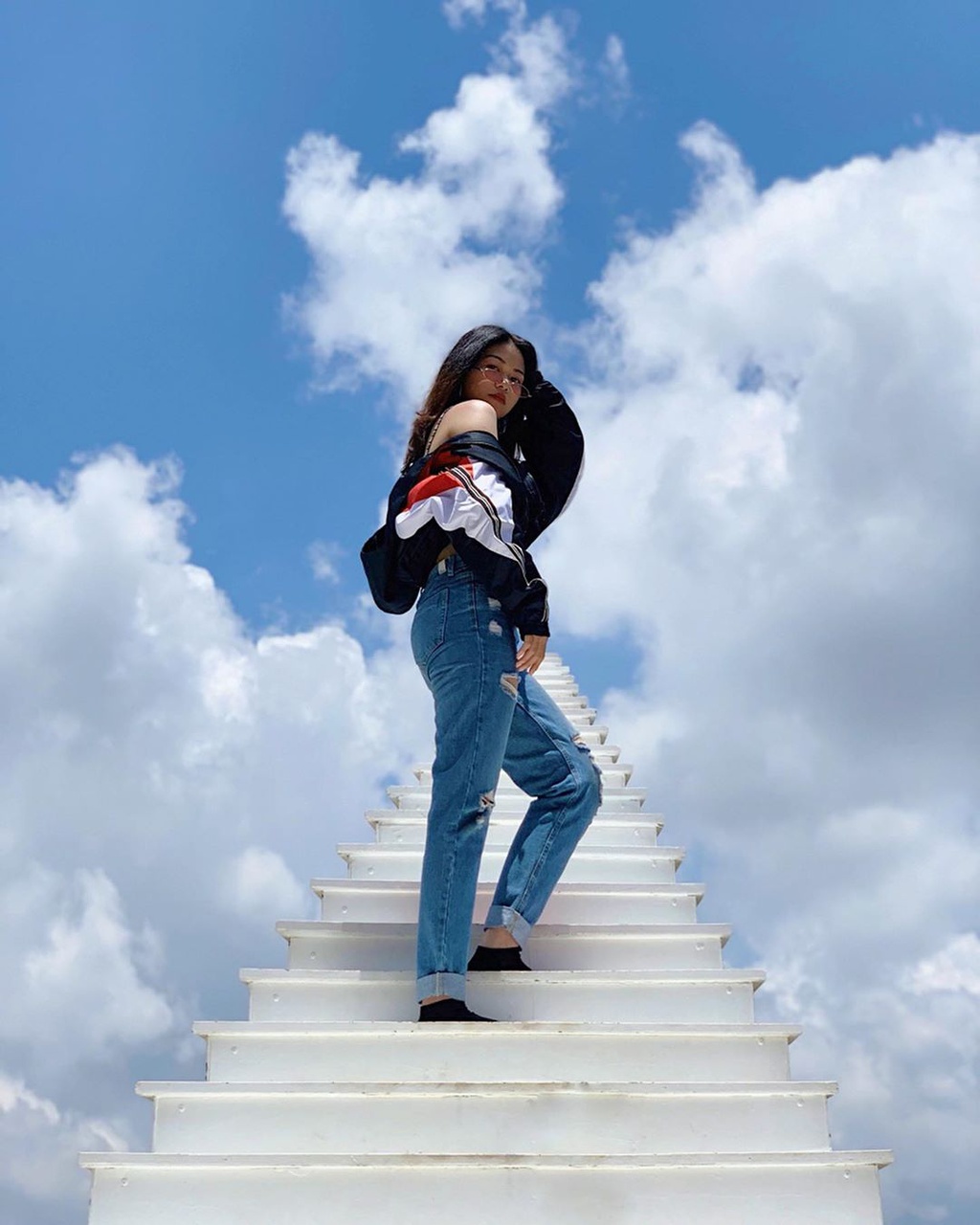 Cầu thang vô cực hay nấc thang lên thiên đường là điểm sống ảo được yêu thích tại đây. Ngoài ra, bạn có thể check-in chiếc võng khổng lồ, những tán anh đào hồng rực, khu vực xích đu… Vào tháng 12, đến đây, bạn sẽ có cơ hội ngắm vườn hoa hướng dương vàng rực. Địa chỉ: Dốc số 7, TP Đà Lạt. Ảnh: I.m.k.e.l.l.y.