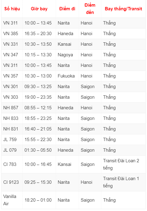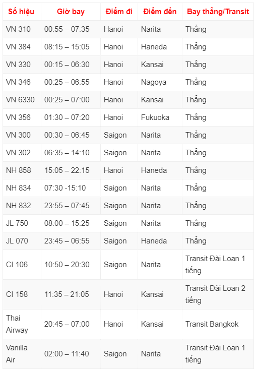Thời gian bay: Thời gian bay thẳng sang Nhật là 5 tiếng. Bạn lưu ý thời gian bay cho thích hợp để đảm bảo phù hợp sức khỏe, cũng như đặt phòng khách sạn tương ứng. Chẳng hạn, nếu giấc ngủ rất quan trọng với bạn thì hãy tránh bay chuyến 5-6 giờ vì như vậy bạn phải lọ mò dậy từ 2-3 giờ sáng.