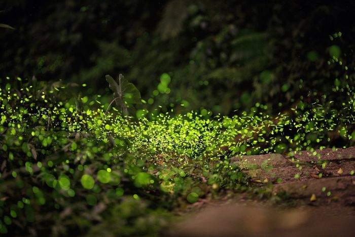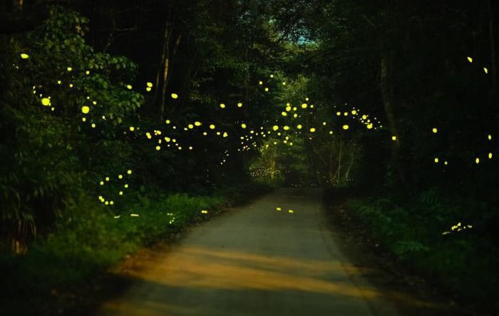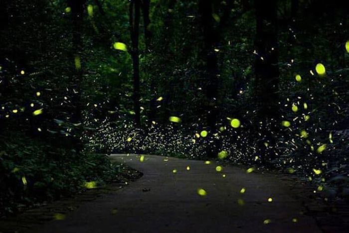 Khi ấy cả trăm ngàn con đom đóm tụ lại với nhau lấp lánh như những đốm lửa nhỏ xinh tạo nên một không gian mờ mờ ảo ảo như lạc vào thế giới thần tiên cổ tích.