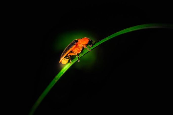 Từng đàn đom đóm lấp lánh xuất hiện từ màn đêm. Những đốm sáng lập lòe ban đầu chỉ rải rác rồi dần tụ lại, chúng hợp vào nhau lấp lánh như những quả cầu sáng nhỏ xinh, lung linh trong đêm tối.