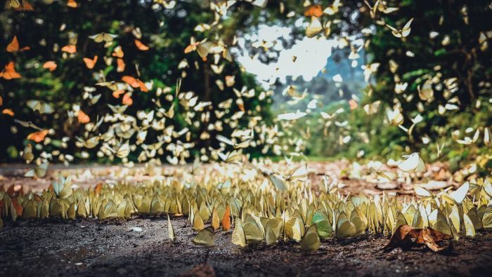 Không chỉ có khung cảnh đom đóm ảo diệu, vườn Cúc Phương hiện có hơn 400 loài bướm khác nhau, trong đó có một số loài vô cùng quý hiếm. Thế nên đến đây vào mùa này bạn sẽ còn có cơ hội bắt hặp hàng triệu con bướm đủ màu sắc bay rợp trời bồng bềnh như mây tạo nên một khung cảnh vô cùng kinh ngạc.