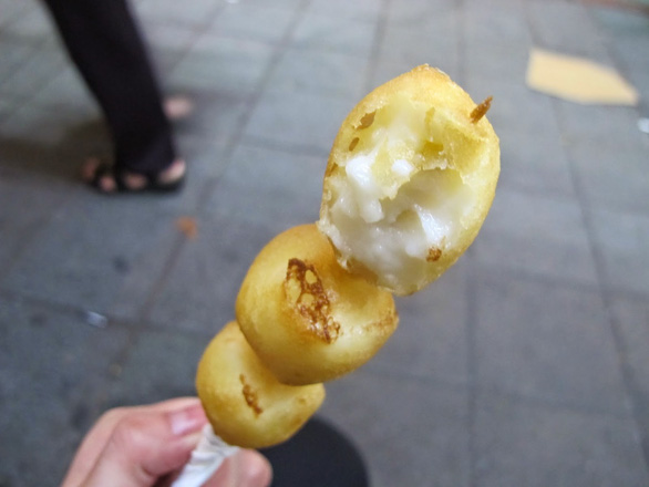 Sữa chiên là một trong các món bạn nên thử khi đặt chân đến chợ Nhiêu Hà. Món này được chế biến bằng cách nhúng các khối sữa đã được đông lạnh trong bột, sau đó chiên lên. Mỗi thanh sữa có giá 20 Tân Đài Tệ (khoảng 15.000 đồng).