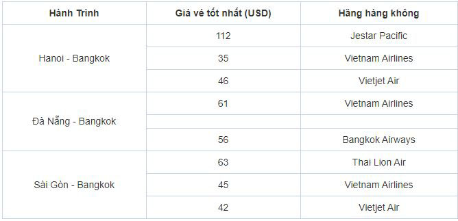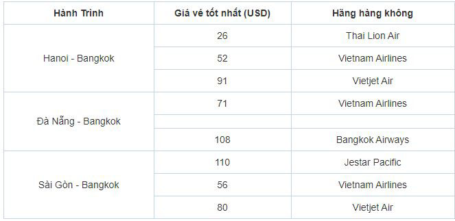 1. Bảng giá vé máy bay đi Thái Lan một số chặng phổ biến