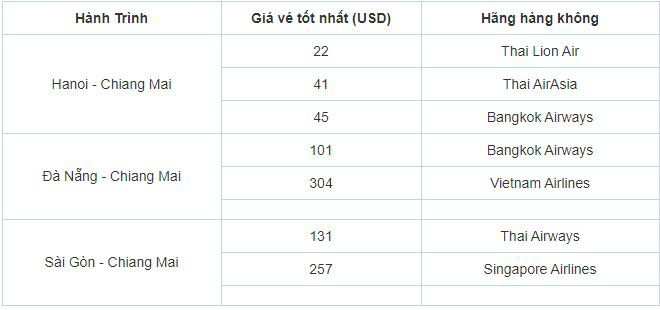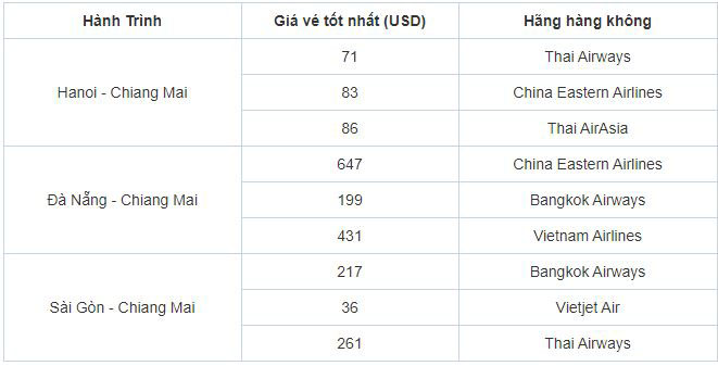 Hành trình khứ hồi từ Việt Nam đi Chiang Mai (CNX):