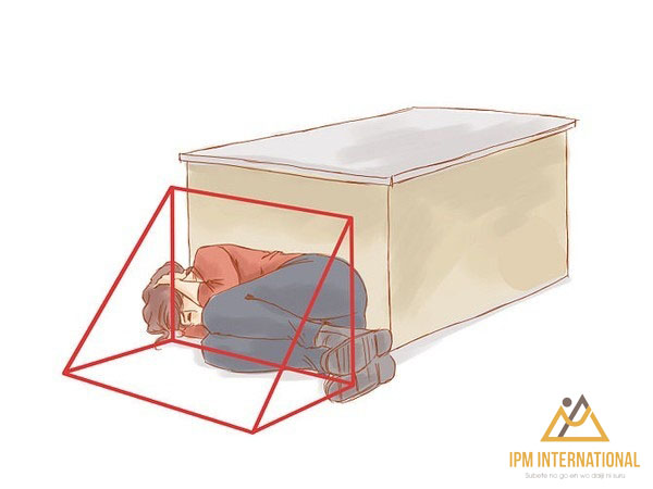 Hãy trốn dưới một vật lớn và ổn định như bảng, giường, hoặc khung cửa, cuộn tròn người, che đầu và chờ đến khi động đất dừng lại.