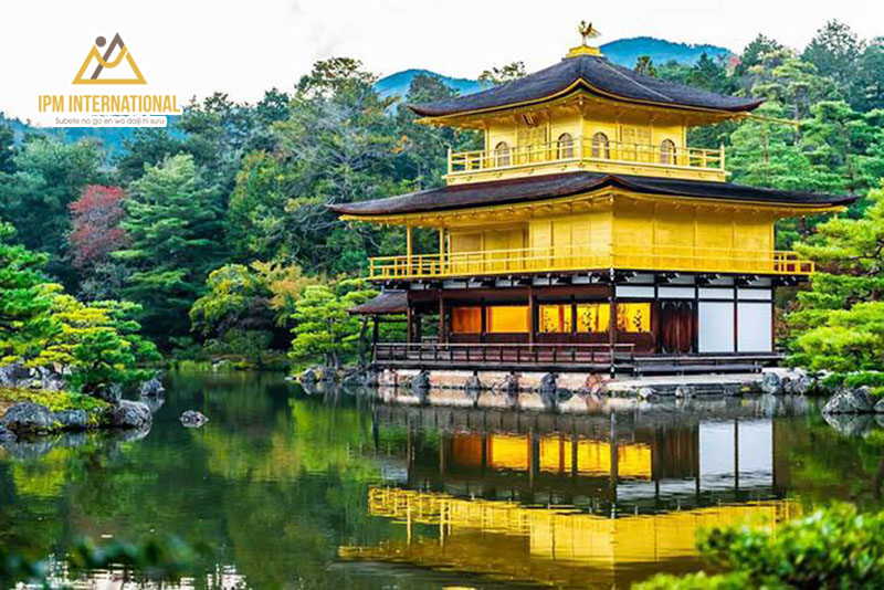 📌 Chùa Vàng “Kinkakuji” (Golden Pavilion) - đây có lẽ là ngôi đền lộng lẫy nhất, hai tầng trên cùng của ngôi đền được dát vàng lá, tạo nên hình ảnh phản chiếu rực rỡ trên mặt hồ bao quanh ngôi đền.