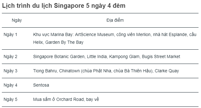 Singapore tuy là một đảo quốc nhỏ nhưng cũng đủ chốn vui chơi, đủ để các vị khách luôn bận rộn mà chẳng bao giờ chán. Trên đây chỉ là những gợi ý từ Cosmos Travel, bạn hoàn toàn có thể sắp xếp lại thứ tự tham quan để phù hợp với lịch trình tour Singapore 5 ngày 4 đêm của mình. Vậy là đầy đủ mọi thứ cần chuẩn bị, chỉ thêm một combo du lịch Singapore - trọn gói đặt vé máy bay và phòng khách sạn là sẵn sàng đi ngay rồi nhỉ!