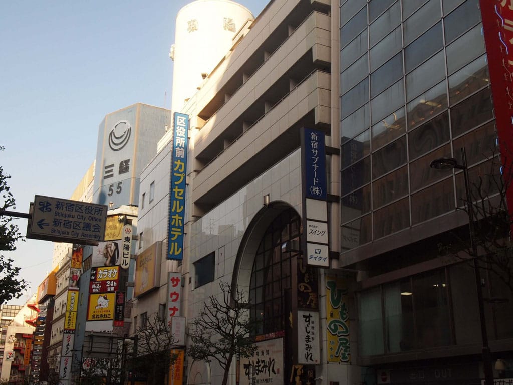 Khách sạn Capsule phía trước tòa nhà thị chính quận Shinjuku cách cửa đông ga JR Shinjuku, ga Nishibu Shinjuku 4 phút đi bộ.
