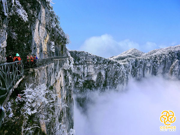+ Khi lên tới đỉnh của Thiên Môn Sơn, Quý khách sẽ đi theo con đường bao quanh những đỉnh núi, xuyên từ đỉnh núi này sang đỉnh núi khác. Tham quan Sạn Đạo Kính (con đường gác kính trên vách đá). Một bên là núi, một bên là mây, thỉnh thoảng có thêm những lá bùa may mắn màu đỏ rực rỡ sẽ khiến Quý khách cảm thấy lạc như lạc vào chốn bồng lai tiên cảnh, như đang đi trên 9 tầng mây của thiên đường.