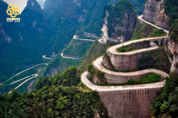 ▪️ Sau khi ăn sáng, đoàn tham quan Thiên Môn Sơn – một kỳ quan nổi tiếng nhất của Trương Gia Giới – nơi đây cũng là nơi biểu diễn nhiều lần máy bay xuyên vượt động Thiên Môn và đua nhảy dù quốc tế (1 lượt đi cáp treo + 1 lượt đi ô tô để trải nghiệm 99 khúc cua ngoạn mục) với sự điều khiển xe của những người tài xế tài tình). Thiên Môn Sơn nằm trong vườn quốc gia Núi Thiên Môn, Trương Gia Giới, ở tây bắc tỉnh Hồ Nam, Trung Quốc. Ngọn núi này rất nổi tiếng với con đường trên trời và hệ thống cáp treo tại Thiên Môn được tuyên bố trong các ấn phẩm du lịch là "cáp treo dài nhất tại một ngọn núi cao nhất trên thế giới” với 98 cabin cáp treo và tổng chiều dài lên tới hơn 7.400 mét, độ cao của ga trên của tuyến cáp treo là 1.279 mét (bao gồm xe công cộng và 1 lượt cáp treo đi lên). Từ cáp treo Quý khách có thể ngắm toàn cảnh thị trấn và cảnh rừng núi nguy nga tráng lệ, ngắm cung đường được coi là đường đua nguy hiểm nhất thế giới với 99 khúc cua ngoạn mục.