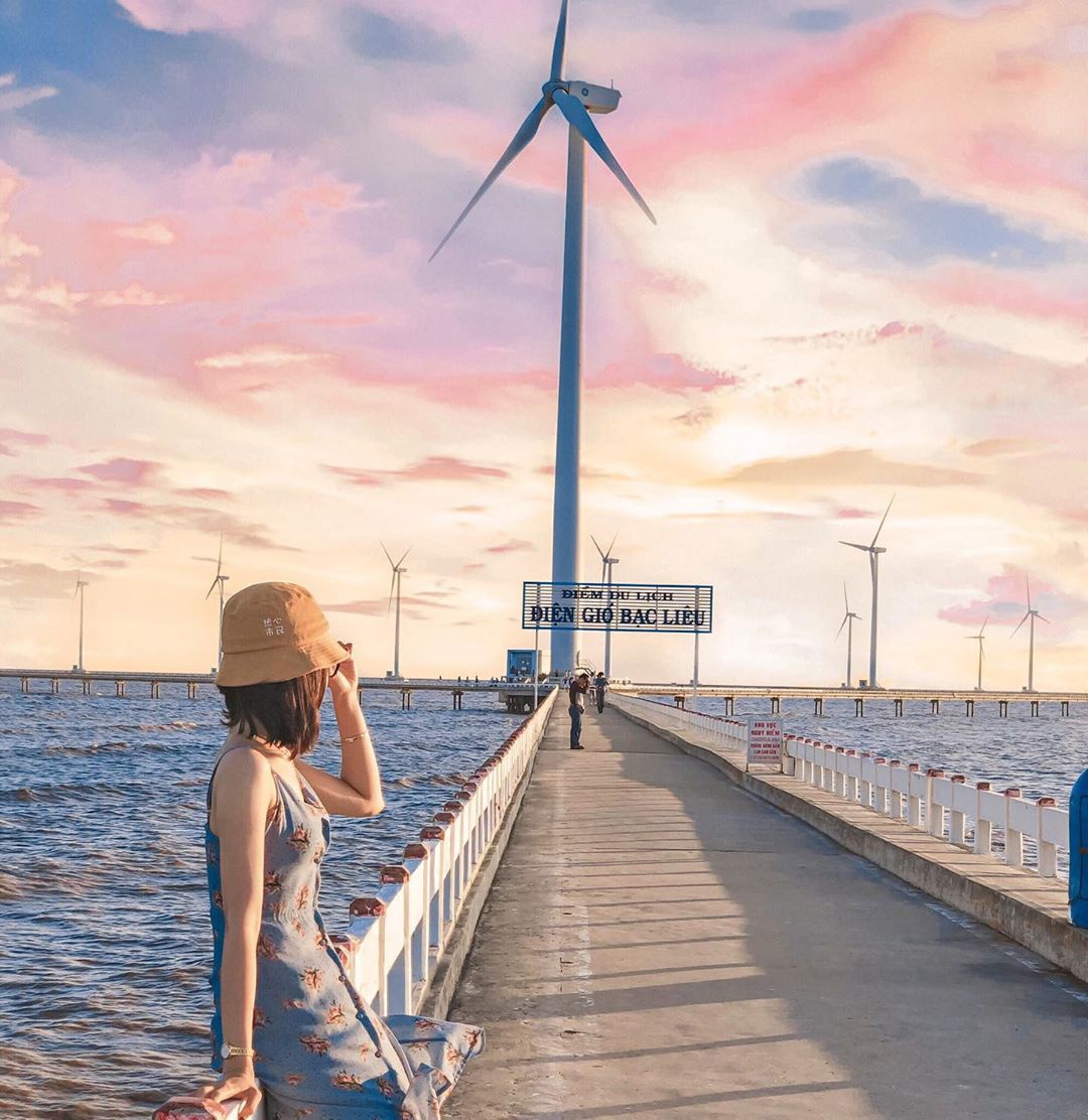 Nằm cách trung tâm thành phố Bạc Liêu tầm 20 km, cánh đồng điện gió nhanh chóng trở thành điểm đến được nhiều bạn trẻ truy tìm. Từ đằng xa, du khách sẽ phải choáng ngợp với hàng tua bin gió khổng lồ, trải đều tăm tắp trên khung cảnh thơ mộng. Bạn có thể tha hồ “diễn sâu” giữa khung cảnh trời Tây ngay tại Việt Nam. Ảnh: Ngocmai2907.