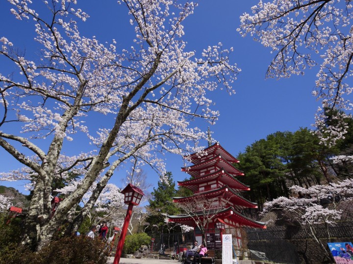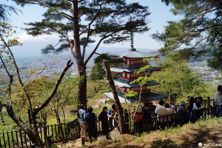Phong cảnh bao gồm “Núi Phú Sĩ, hoa anh đào, tháp 5 tầng” có thể quan sát từ địa điểm ngắm cảnh trên cao nằm phía sau tháp 5 tầng. Các bạn cần trèo lên 398 bậc thang để đến địa điểm quan sát trên cao.