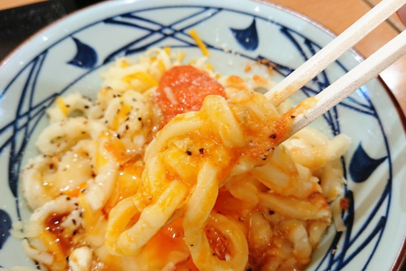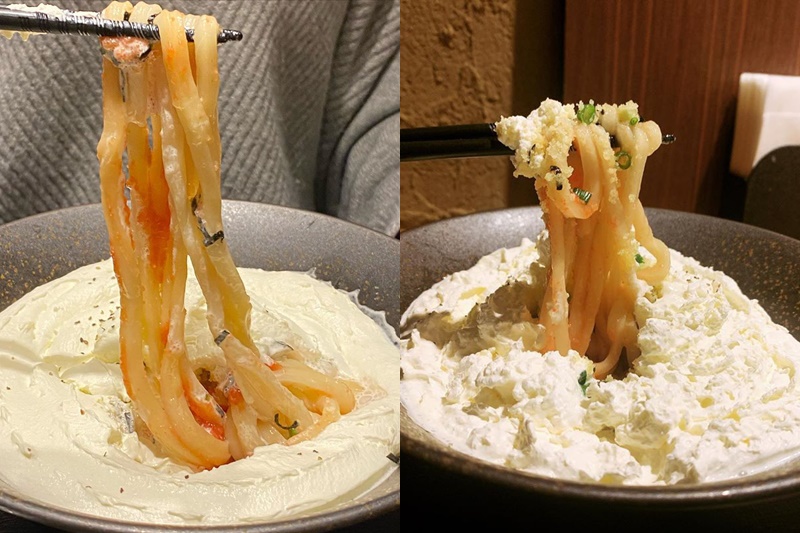 Đây là món mì udon trộn đang làm mưa làm gió tại Shibuya. Món này có tên là Menta Cream Cheese Udon. Lớp kem tươi dày phía trên chính là kem phô mai, bên dưới gồm có mì udon, vài miếng cá hồi (có thể có hoặc không tùy theo bạn gọi), hành lá, rong biển và vài gia vị khác.