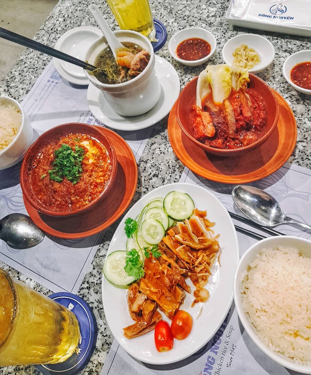 Cơm gà Đông Nguyên (quận 7, 5): Thực đơn quán đa dạng, nhưng được ưa thích nhất là các món ăn chế biến từ gà như đùi gà luộc, nướng, cà ri... Quán có nước chấm được pha theo công thức riêng, ăn kèm gà rất bắt vị. Nhiều ý kiến cho rằng cơm được nấu tơi vừa phải, thơm mùi mỡ gà, tuy nhiên, một số món ăn chưa được nêm nếm thấm vị.