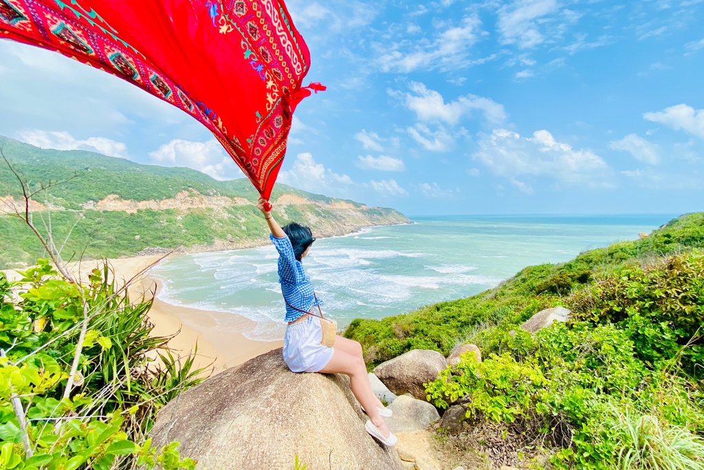 Nhìn từ con đường lên Mũi Điện, bạn sẽ thấy một bãi tắm nguyên sơ, nước trong veo. Đó là bãi Môn, một trong những bãi tắm đẹp nhất Phú Yên. Tuy nhiên, bãi này khá ít người tắm nên du khách cần cẩn thận, đặc biệt với những gia đình có trẻ nhỏ. Góc chụp đẹp để tham khảo là nhìn từ trên cao xuống, bao trọn núi, mây biển, cây vào cùng bức hình. Các phụ kiện như khăn boho cũng giúp bức ảnh thêm ấn tượng.