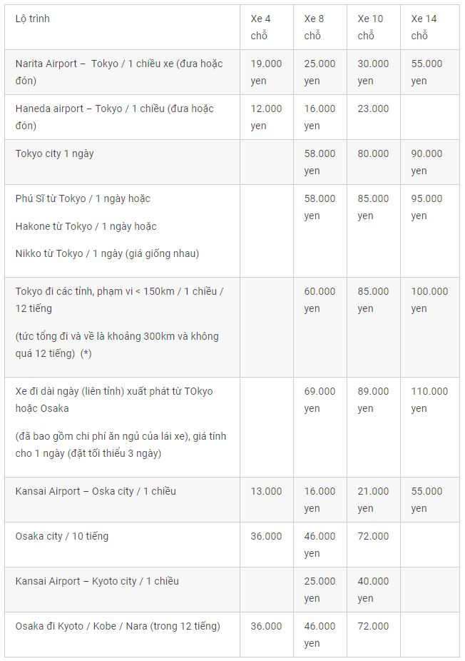 Các bạn có nhu cầu thuê xe riêng ở Nhật Bản có thể tham khảo bảng giá xe dưới đây, nếu cần đặt xe & tư vấn lộ trình đi lại ở Nhật Bản, mời bạn liên hệ chúng tôi qua HOTLINE: