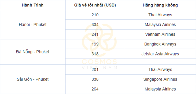 Chặng bay từ Đà Nẵng tới Phuket hiện có Vietnam Airlines, , Singapore Airlines, Korean Air.. đang khai thác với khoảng 20 chuyến bay mỗi ngày. Giá vé chặng bay này khoảng 125 - 600 USD, khá đắt so với những chuyến bay từ Hà Nội.
